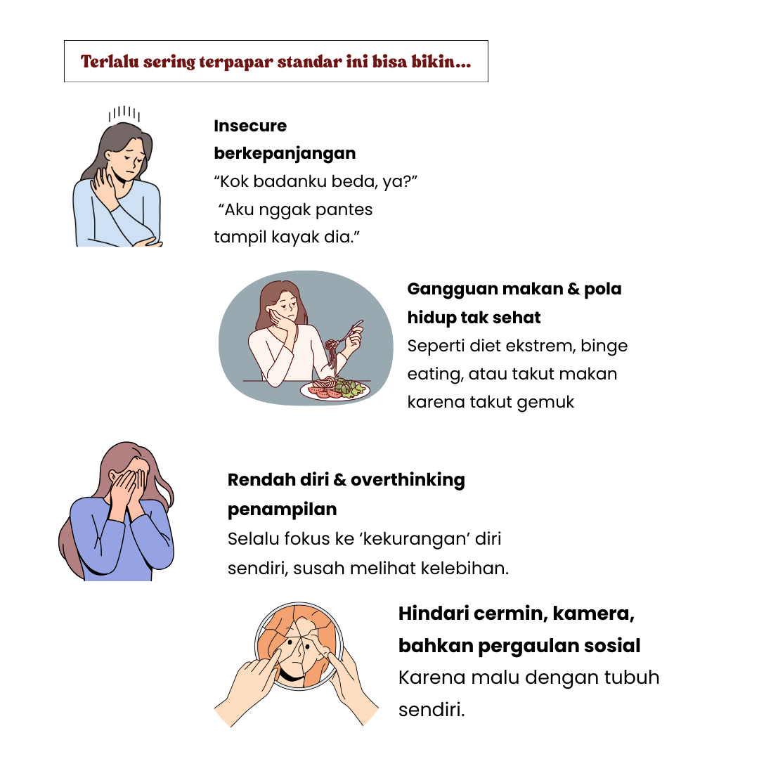 Media sosial, iklan skincare, tren diet ekstrim, membuat standar ini makin masif dan seringkali tidak realistis.