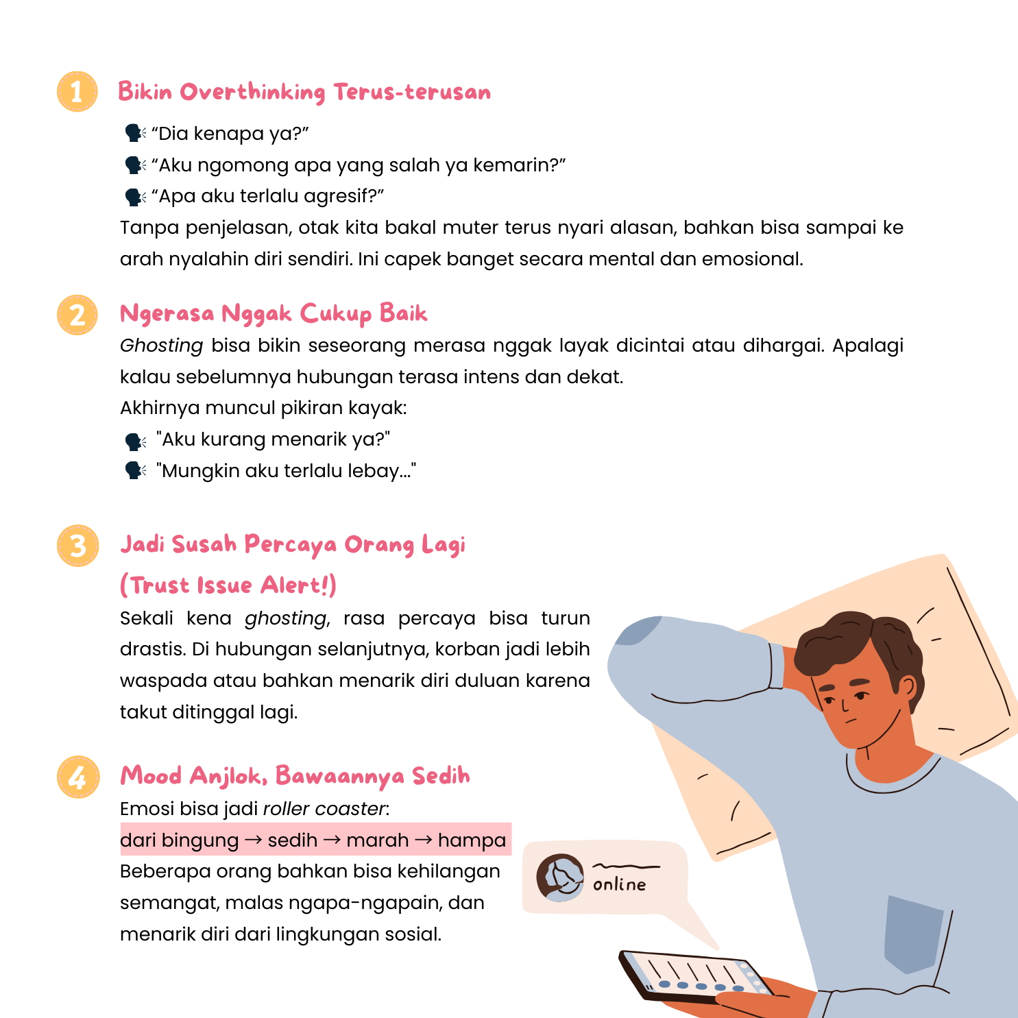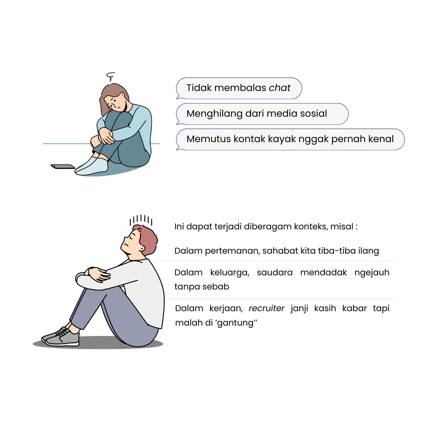 Ghosting itu istilah buat seseorang yang memutus semua komunikasi secara tiba-tiba tanpa memberikan alasan apapun. Fenomena ini makin sering terjadi di era digital, di mana komunikasi lebih banyak lewat chat, DM, atau dating apps. Kadang chat kamu masih dibaca (read), tapi gak pernah direspons lagi. Lama-lama, profile mereka juga bisa hilang beneran dari radarmu.